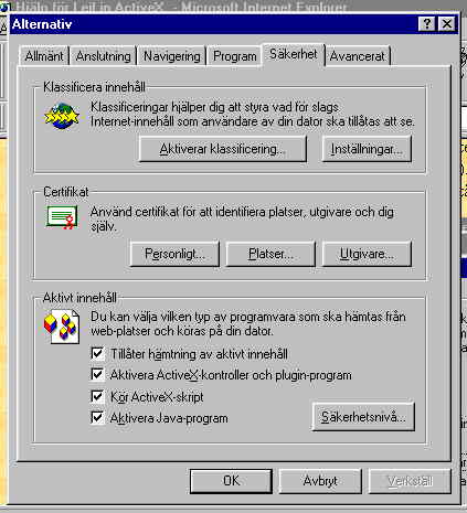 "aktivt innehåll" skall kunna hämtas och köras på Din dator.